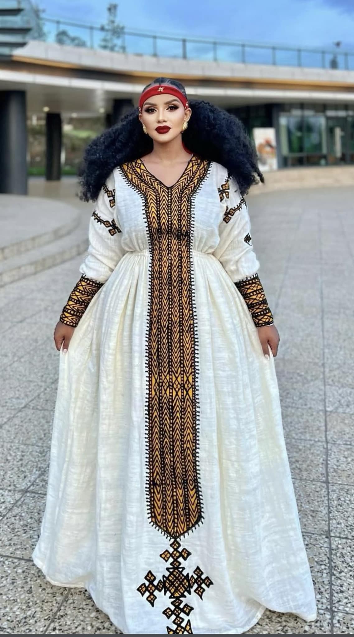 Gracefully handwoven with traditional Ethiopian cotton and detailed with vibrant tibeb patterns, this dress embodies timeless beauty. Perfect for church, holidays, or cultural gatherings.