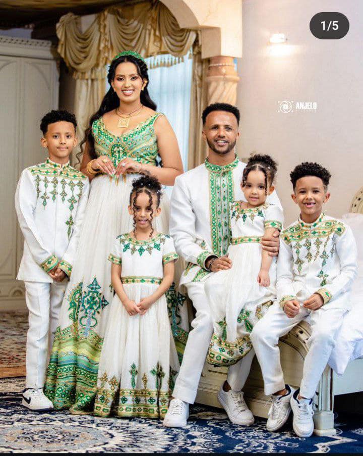 Dress the whole family in matching Habesha outfits! Coordinated designs for men, women, and kids make for stunning photos and a meaningful cultural statement at any event.